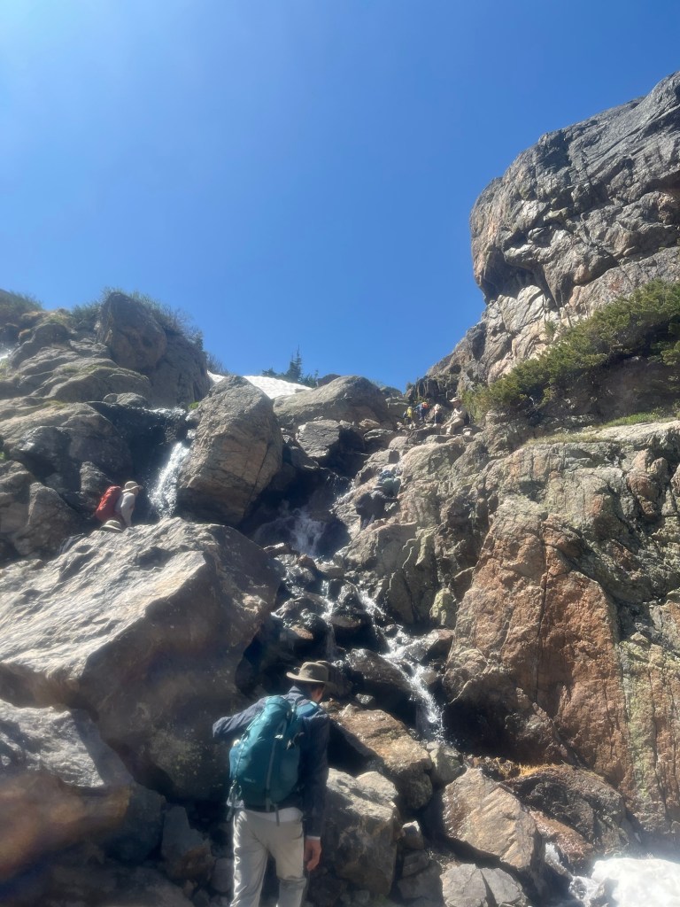 There were a couple groups congregated here sizing up the route forward. This was no longer a trail but a small climb up some rocks that paralleled the waterfall. It reminded me of some portions of Devil’s Ladder in Ireland, fortunately I had waterproof boots this time, making for an easier scramble.