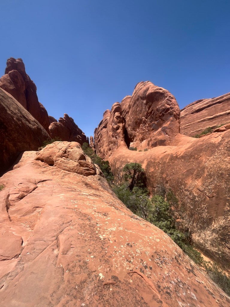 It had warmed up to nearly 90 at this point with intermittent gusts of wind. My plan to stop and eat on the trail had never materialized. I had decided not to stop for longer than it took to take a picture or adjust my pack, fearing I would only slow down after an extended break. Including the three mile round trip to Delicate Arch, I had nearly 10 miles on the day and my stomach let me know. In my mind I started counting down the miles until the end of the trail.