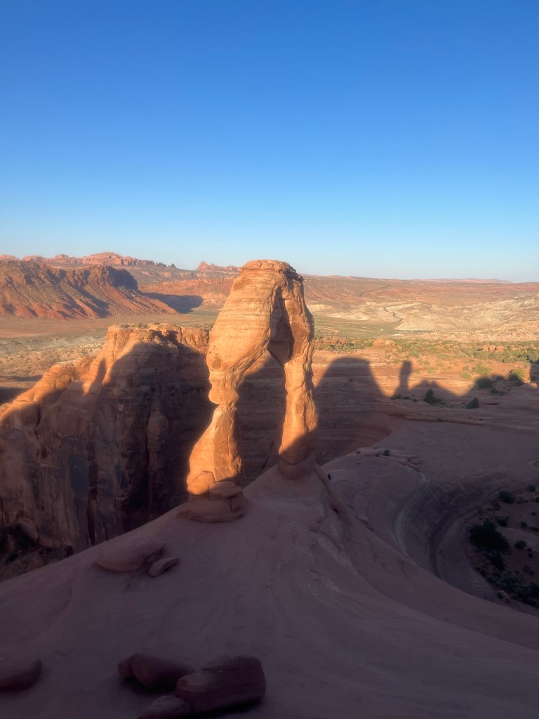 I made it with minutes to spare and witnessed one of my favorite sunrises. The viewing area for Delicate Arch faces west, so the assembled crowd all faced east to watch the sun crest over a distant rock formation, then turned west to watch the shadow disappear from the arch, with light slowly taking its place.