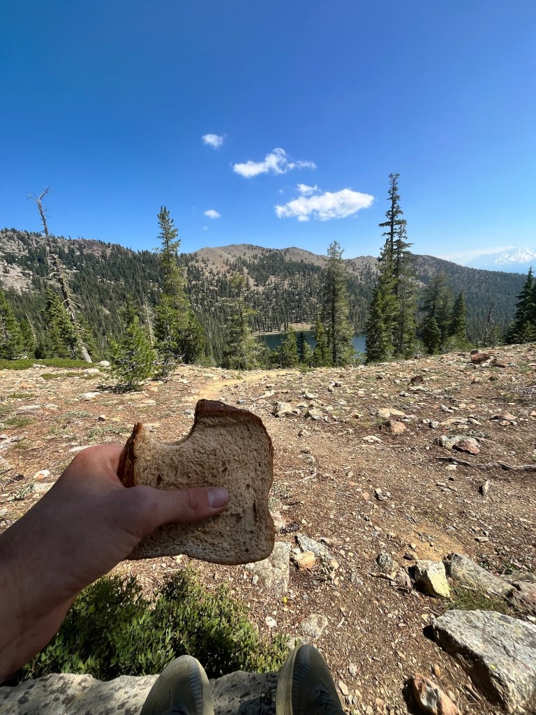 The view is spectacular. Not wanting another smushed sandwich for lunch, I enjoy a meal of cliff bars and an apple, while the others enjoyed some deer jerky.