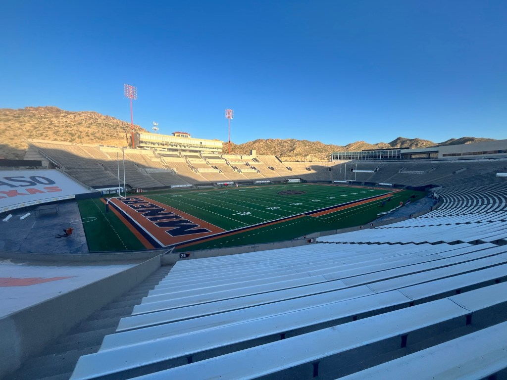 It’s only 1.5 hours to El Paso and my first stop is the Sun Bowl. The gates are open so I start walking down the tunnel and the field quickly comes into view. At first I think I have the place to myself, but soon hear people talking and a golf cart with some athletic trainers comes into view. They had just set up some coolers of sport drink for practice. Although, I wanted to go out on the field I decided not to push my luck and looked at it from the stands.
