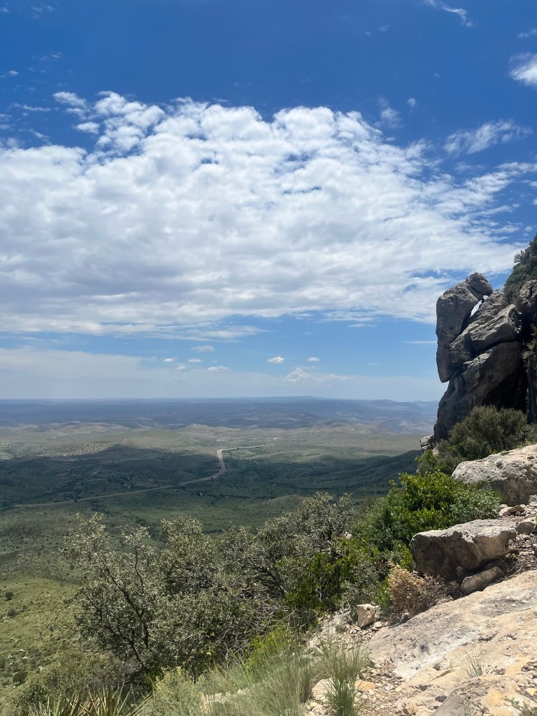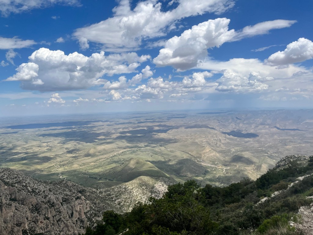 There is a brief downhill that takes us off the first mountain and onto Guadalupe Peak. We are welcomed with another set of exposed switchbacks. The views from the top of this section of switchbacks provide a great view of the valley below. It stretches for miles and we can clearly see the shade of each individual cloud covering portions of the valley.